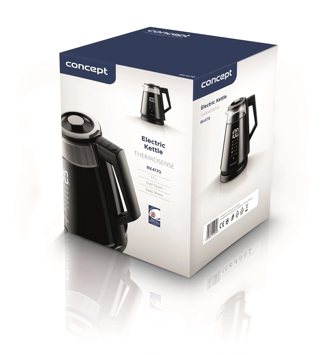 ThermoSense RK4170 moderno je stakleno električno kuhalo za vodu koje se ističe elegantnim dizajnom i čitljivim digitalnim zaslonom. Nudi kapacitet od 1,7 litara, mogućnost regulacije temperature u četiri koraka (40°C, 60°C, 80°C, 100°C) te funkciju održavanja temperature (KEEP WARM) do 4 sata.