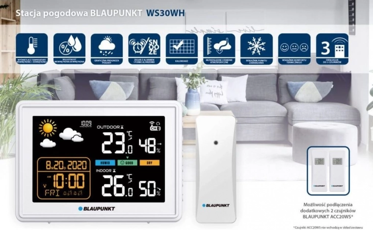 Meteo stanica Blaupunkt WS30WH pouzdan je kućni pomoćnik za kontrolu klime. U stvarnom vremenu prikazuje temperaturu i vlažnost unutra i vani, prati njihove trendove te pohranjuje dnevne minimume i maksimume. Zahvaljujući grafičkoj prognozi za 12–24 sata lako ćete predvidjeti što vas očekuje. Ugrađeni barometar prikazuje apsolutni atmosferski tlak.
