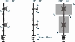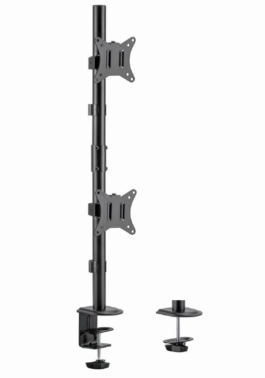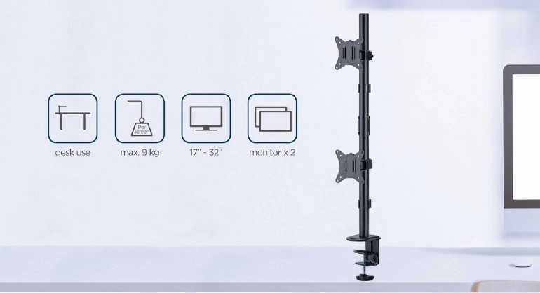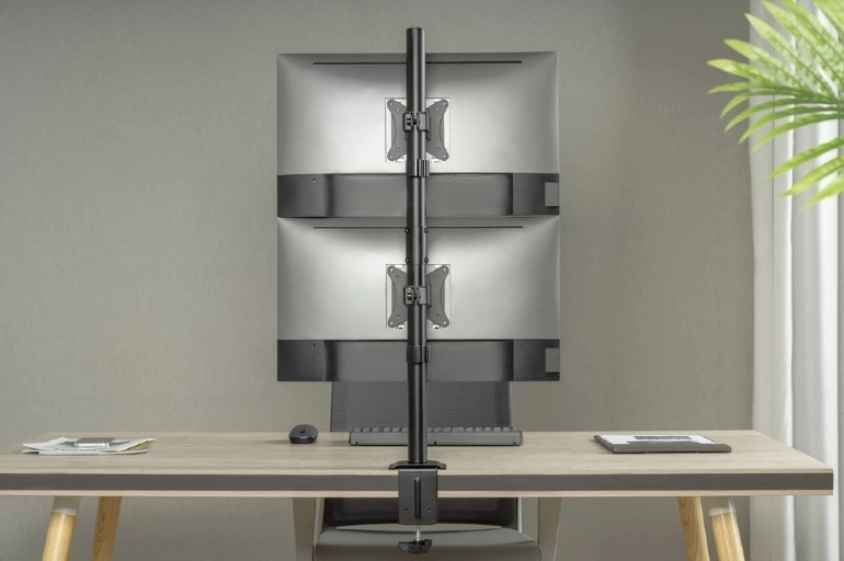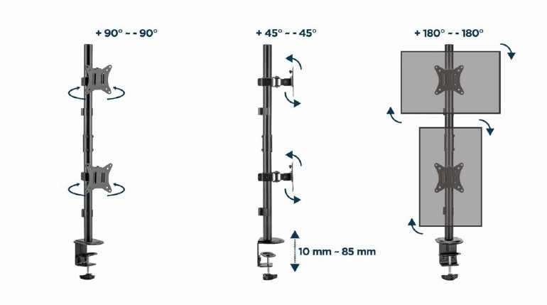 Ovaj metalni stalak za dva monitora omogućuje postavljanje zaslona jedan iznad drugog i tako stvara kompaktno, ergonomsko i produktivno radno okruženje. Zahvaljujući fleksibilnim zglobovima lako podešavate nagib, zakretanje i orijentaciju iz pejzažnog u portretni način i obratno.