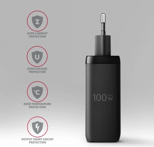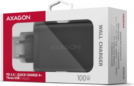 GaN punjač AXAGON 100 W s 3 porta (2× USB‑C, USB‑A). Podrška za PD 3.0, QC 4+, PPS, SFC 2.0, Apple PD 20/27 W. Kompaktan, siguran i idealan za putovanja.