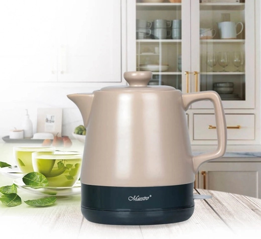 Stilsko keramičko kuhalo za vodu MAESTRO s volumenom 1 l i snagom 1200 W donosi elegantan dizajn i jednostavno održavanje. Keramičko kućište zadržava toplinu i smanjuje nakupljanje kamenca, 360° rotirajuća baza olakšava rukovanje, a osvijetljena sklopka zajedno s automatskim isključivanjem povećava sigurnost. Tu su i unutarnji MAX pokazivač, skriveni grijaći element te pretinac za kabel.