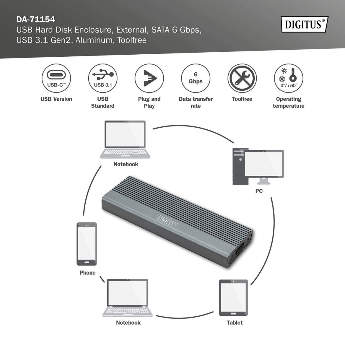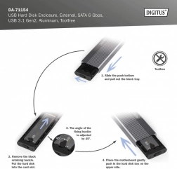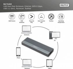 Ugradnja je pitanje trenutka – bez vijaka i alata. Podržane su popularne veličine M.2 (2230/2242/2260/2280), pa lako koristite većinu SATA M.2 SSD‑ova do 8 TB. Zahvaljujući unatrag kompatibilnosti s USB 3.1/3.0/2.0/1.1, kućište možete priključiti na gotovo svaki uređaj.
