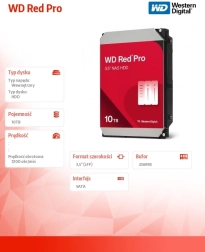 Pouzdani mrežni tvrdi disk za NAS: WD Red Pro 10 TB nudi veliki kapacitet, brzinu vrtnje 7200 o/min, sučelje SATA i 256 MB predmemorije. Zahvaljujući tehnologiji NASware optimiziran je za neprekidan rad 24/7, višekorisničko okruženje i konfiguracije RAID, s naglaskom na kompatibilnost, RV senzore za smanjenje vibracija i pouzdanost u NAS okruženju.