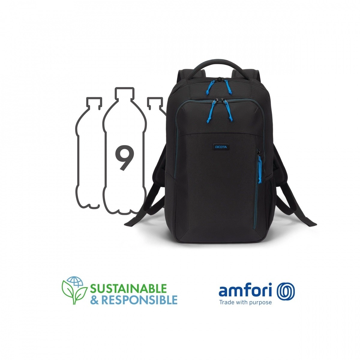 Ruksak je izrađen od recikliranog PET-a (9 boca), otporan je na svakodnevnu upotrebu, a upotpunjuju ga kvalitetni patentni zatvarači, metalni logo i decentni plavi detalji.