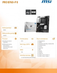 MSI PRO B760-P II pouzdana je osnova za profesionalne konfiguracije i snažna kućna računala. Podržava procesore Intel Core 14./13./12. generacije i donosi veću propusnost memorije zahvaljujući dvokanalnoj DDR5. Kvalitetan 6-slojni PCB s 2 oz bakra i premium komponentama doprinosi dugom vijeku i stabilnom radu.