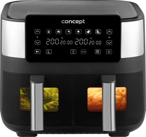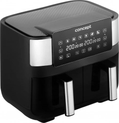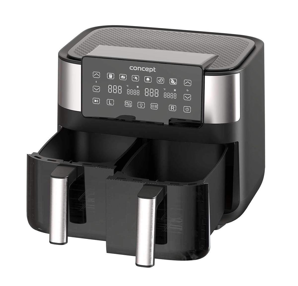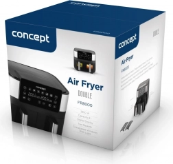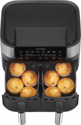 Toplozračna friteza s dvostrukom ladicom omogućuje brzo, hrskavo i zdravije kuhanje zahvaljujući cirkulaciji vrućeg zraka. Uz minimalnu količinu ulja postižete sjajne rezultate bez mirisa i nereda od prženja. Zahvaljujući dvjema košarama od 4 litre možete pripremiti dva različita jela istodobno bez miješanja okusa.