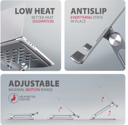 Uživajte u ugodnom radnom okruženju s kompaktnim i prijenosnim stalkom koji zadovoljava vaše potrebe, bilo da radite kod kuće, u uredu ili na putu. Ovaj stalak je izrađen od izdržljivih aluminijskih odljevaka koji osiguravaju njegovu dugovječnost i pouzdanost. Zahvaljujući protukliznoj površini, ne morate se brinuti o neželjenim pomicanjima; vaš će uređaj ostati čvrsto na mjestu bez oštećivanja površine prijenosnog računala ili podloge.