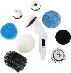 Izmjenjive glave uključuju četke, spužvice i polirne padove za razne površine – pločice, fuge, kade, sudopere, staklo i kuhala. Ugrađena baterija 3,7 V / 2000 mAh pruža do 30 minuta rada s jednim punjenjem, a lako se puni putem USB kabela.