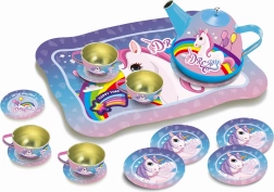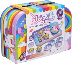 Stilski čajni set s motivom jednoroga unijet će radost u svaku dječju igru domaćinstva. Zahvaljujući čvrstoj metalnoj izradi izdržat će i oduševljeno svakodnevno posluživanje. Šareni koferčić s ručkom omogućuje lako prenošenje i pohranu svih dijelova na jednom mjestu.
