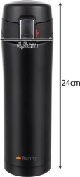 Stilska i funkcionalna termo šalica RUHHY idealan je izbor za svakodnevnu uporabu na poslu, u školi i na putovanjima. Dupla izolacija pouzdano održava temperaturu, dok sigurni poklopac s osiguračem sprječava neželjeno otvaranje i istjecanje tekućine – čak i pri prevrtanju. Elegantni crni dizajn i lagana konstrukcija (samo 0,27 kg) osiguravaju udobno nošenje.