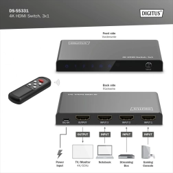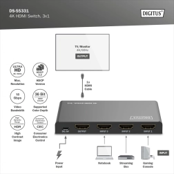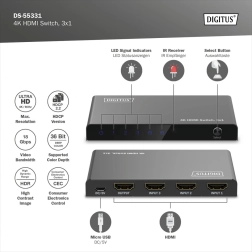 Zaboravite na stalno prekapčanje kabela. Kompaktni prekidač DIGITUS 4K HDMI 3×1 elegantno proširuje vaš sustav s tri punokrvna HDMI ulaza. Zahvaljujući podršci za Ultra HD 4K pri 60 Hz i HDCP 2.3 uživat ćete u oštroj slici i glatkoj reprodukciji s igraćih konzola, set-top boxova, prijenosnih računala ili reproduktora.