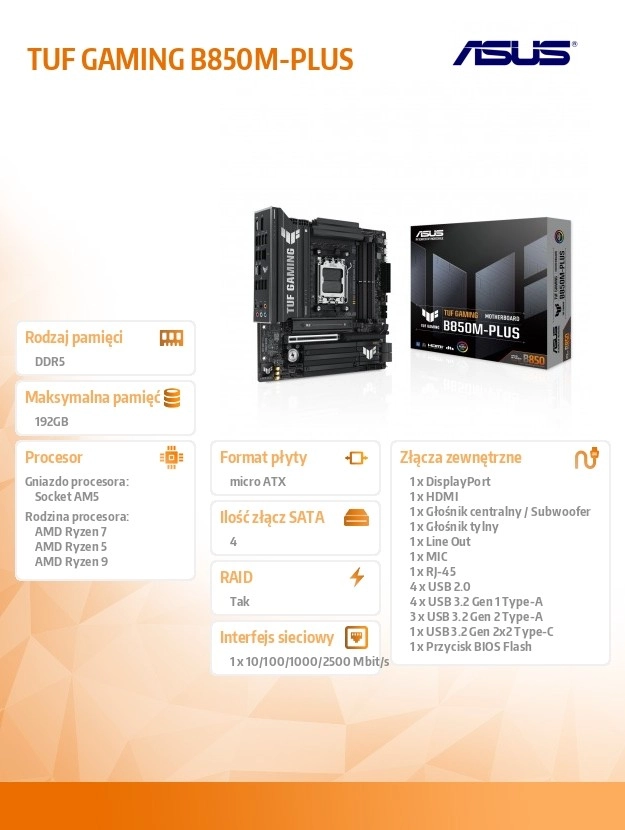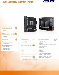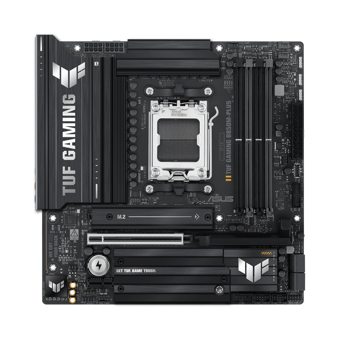 ASUS TUF GAMING B850M-PLUS spaja robusnu konstrukciju s funkcijama spremnima za moderne igre i zahtjevne aplikacije. Zahvaljujući pojačanom napajanju, masivnim pasivnim hladnjacima i promišljenom rasporedu, ploča je spremna za stabilan rad s AMD Ryzen procesorima, i to čak i pod dugotrajnim opterećenjem. Platforma pruža performanse i povezivost koje zahtijevaju napredni radni tokovi i AI aplikacije.