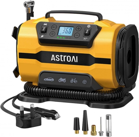 AstroAI je kompaktan i snažan kompresor za svakodnevnu upotrebu. Metalni cilindar i dvostruki motor osiguravaju dug životni vijek i stabilne performanse, dok digitalno mjerenje tlaka u stvarnom vremenu i automatsko isključivanje štite od prenapuhavanja. Fleksibilno napajanje od 12V iz auto-utikača ili 110–240V iz mreže čini ga savršenim pomagačem kod kuće i na putu.