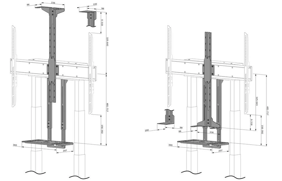 Mogućnost ugradnje polica iznad ili ispod zaslona, uz prilagodbu visine prema potrebi.