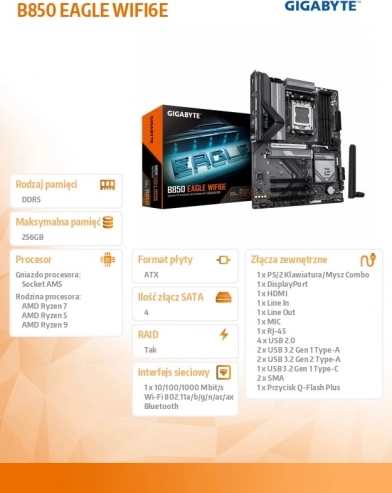 Uđite u novu eru gaminga s pločom B850 Eagle Wi‑Fi 6E. Jednim klikom aktivirate X3D Turbo način koji optimizira performanse za procesore AMD Ryzen 9000/8000/7000, uključujući modele Ryzen 9000 X3D. Dobivate glađe igranje, višu frekvenciju sličica i niži odaziv – idealan izbor za zahtjevne igrače i kreatore.