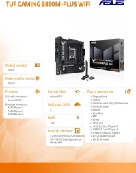 Matična ploča ASUS TUF Gaming B850M-PLUS WiFi kombinira izdržljivu konstrukciju s komponentama vojne klase, poboljšano napajanje i sveobuhvatno hlađenje za stabilne performanse. Nudi modernu povezivost, podršku za najnovije procesore AMD Ryzen te postavke spremne za zahtjevno igranje i AI aplikacije.