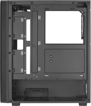 U potpunosti perforirani prednji panel maksimizira dotok zraka, dok prozirna bočnica od kaljenog stakla stavlja komponente u prvi plan.