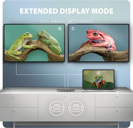 Hub pruža dva USB‑A 5Gbps i jedan USB‑C 5Gbps podatkovni port, može trajno opsluživati i više vanjskih diskova te omogućuje punjenje telefona i tableta do 1.5 A/5 V. Dva HDMI izlaza prenose sliku do 4K/60 Hz (podržani i 2K/120–144 Hz i 1080p/240 Hz) uključujući HDR i višekanalni zvuk. Metalno kućište osigurava izdržljivost i učinkovit odvod topline.