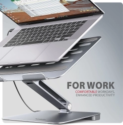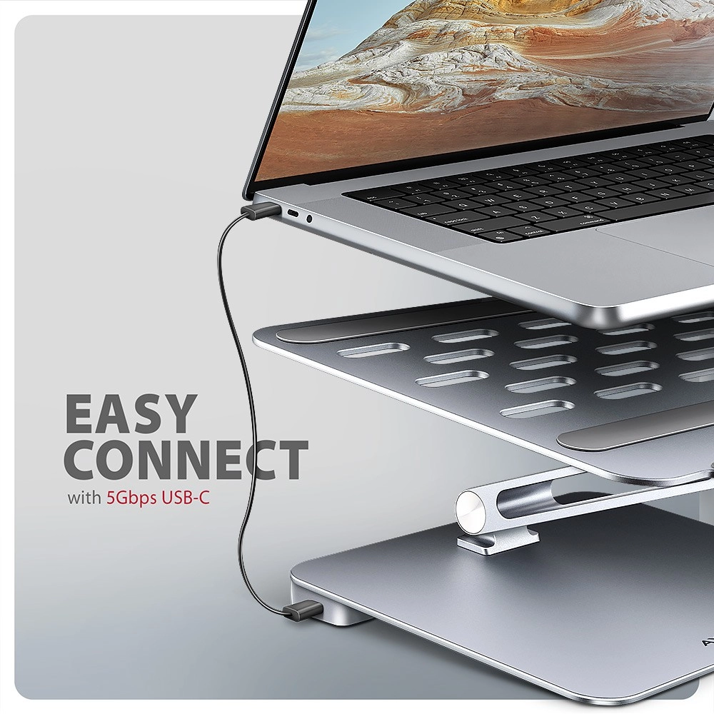 Elegantna i izdržljiva konstrukcija od aluminijske slitine pruža pasivno hlađenje i stabilnost, dok protuklizne površine štite uređaj od ogrebotina. Stalak s dvostrukim zglobom omogućuje precizno podešavanje visine do 205 mm i kuta nagiba kako bi zaslon bio u ravnini s vanjskim monitorom. Hub proširuje vaš prijenosnik za HDMI 4K/60 Hz, 3x USB-A 5Gbps, RJ‑45 Gigabit i USB‑C PD ulaz 100 W.