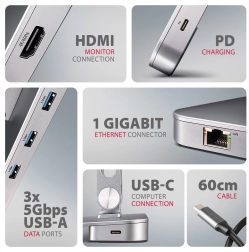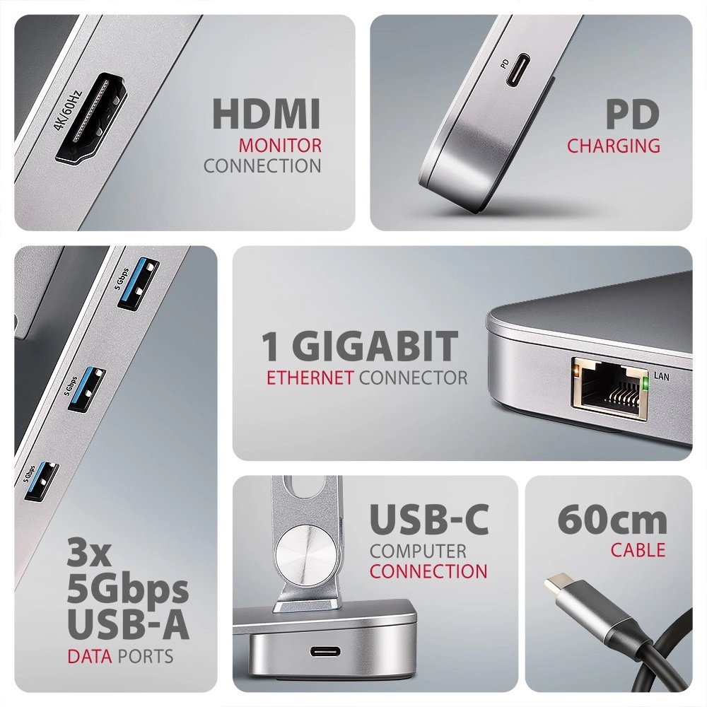 Multifunkcionalni stalak i hub AXAGON HMC-STND pretvara vaše prijenosno računalo ili tablet u punokrvnu radnu stanicu. Nudi 7-u-1 sučelja uključujući HDMI do 4K/60 Hz, 3x USB-A 5Gbps, Gigabit Ethernet i USB-C Power Delivery 100 W. Ergonomski aluminijski stalak s dvostrukim zglobom prikladan je za uređaje 10–16", poboljšava hlađenje i udobnost rada. Povezivanje s prijenosnikom osigurava 60 cm USB‑C kabel, a sve radi odmah zahvaljujući Plug & Play.