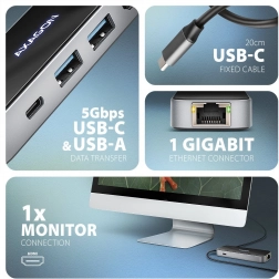 Lagana i izdržljiva konstrukcija od aluminija osigurava učinkovito pasivno hlađenje i premium izgled. Zahvaljujući Plug & Play i Hot Plug priključivanje periferija je pitanje sekundi – bez instalacije. Idealno za moderne prijenosnike bez USB‑A ili video izlaza te za povezivanje telefona s USB‑C.