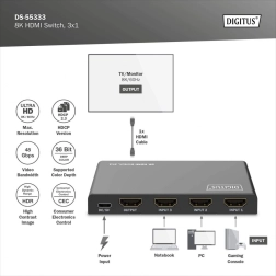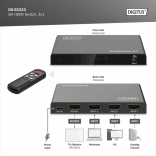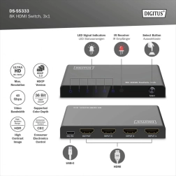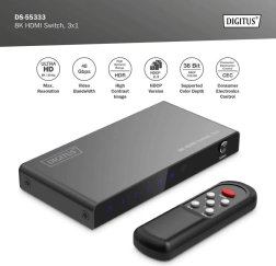 Elegantni i kompaktni DIGITUS 3×1 HDMI preklopnik omogućuje povezivanje do tri HDMI izvora na jedan zaslon. Idealan za TV na zidu, igraće konzole, reproduktore ili računala – dovoljan je jedan HDMI kabel do zaslona, a između izvora prebacujete daljinski.