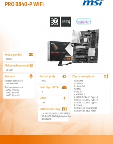 MSI PRO B840-P WIFI ističe se čistim dizajnom u skladnoj srebrno‑crnoj kombinaciji koja se odlično uklapa u bijele i crne konfiguracije. Snažan naponski sklop Direct 7+2+1, 6‑slojni PCB s 2oz bakrom te tehnologije Core Boost i Memory Boost osiguravaju stabilnost i visoke performanse za moderne AMD Ryzen procesore.