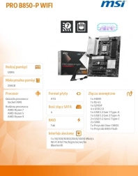 Matična ploča MSI PRO B850-P WIFI za ležište AMD AM5 spaja čist, elegantan dizajn s vrhunskim mogućnostima za rad i igranje. Nudi Wi‑Fi 7 s EZ Antenna, brzi 5G LAN, podršku za PCIe 5.0 za M.2, dvo-kanalni DDR5 do 8200+ MT/s (OC) i robusno napajanje 12+2+1 za stabilne performanse s procesorima Ryzen 9000/8000/7000.
