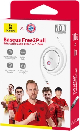 Stilski izvlačni kabel Baseus Free2Pull s USB‑C na USB‑C donosi brzo punjenje 100 W, podesivu duljinu (35/60/83/100 cm) i kompaktan dizajn za lako prenošenje. Zahvaljujući stabilnom naponu i zaštiti od pregrijavanja, punjenje je sigurno, dok izdanje s logotipom FC Bayern München uređaju daje premium sportski izgled.