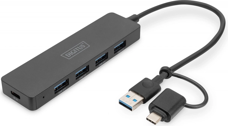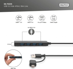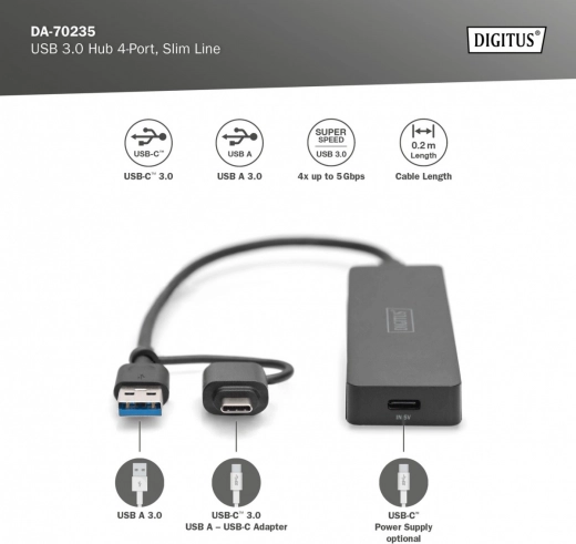 USB Hub 3.0 DIGITUS Slim Line savršeno je rješenje za proširenje povezivosti na svakom radnom mjestu. Ovaj hub omogućuje povezivanje do četiri USB uređaja i njihovo istodobno korištenje. Omogućuje praktično korištenje više uređaja za upravljanje ili pohranu podataka. Zahvaljujući tehnologiji USB 3.0, prijenos podataka može doseći brzinu do 5 Gbps, što jamči brzu razmjenu podataka. Zahvaljujući vitkom dizajnu, ovaj hub s 4 porta idealan je suputnik na putovanjima, ali i neizostavan kod kuće i u uredu.
