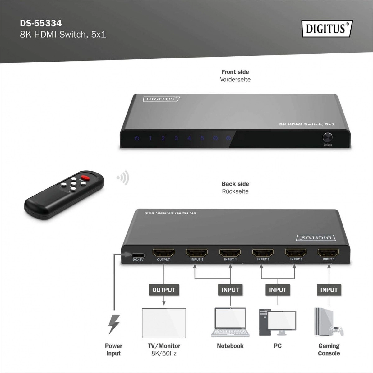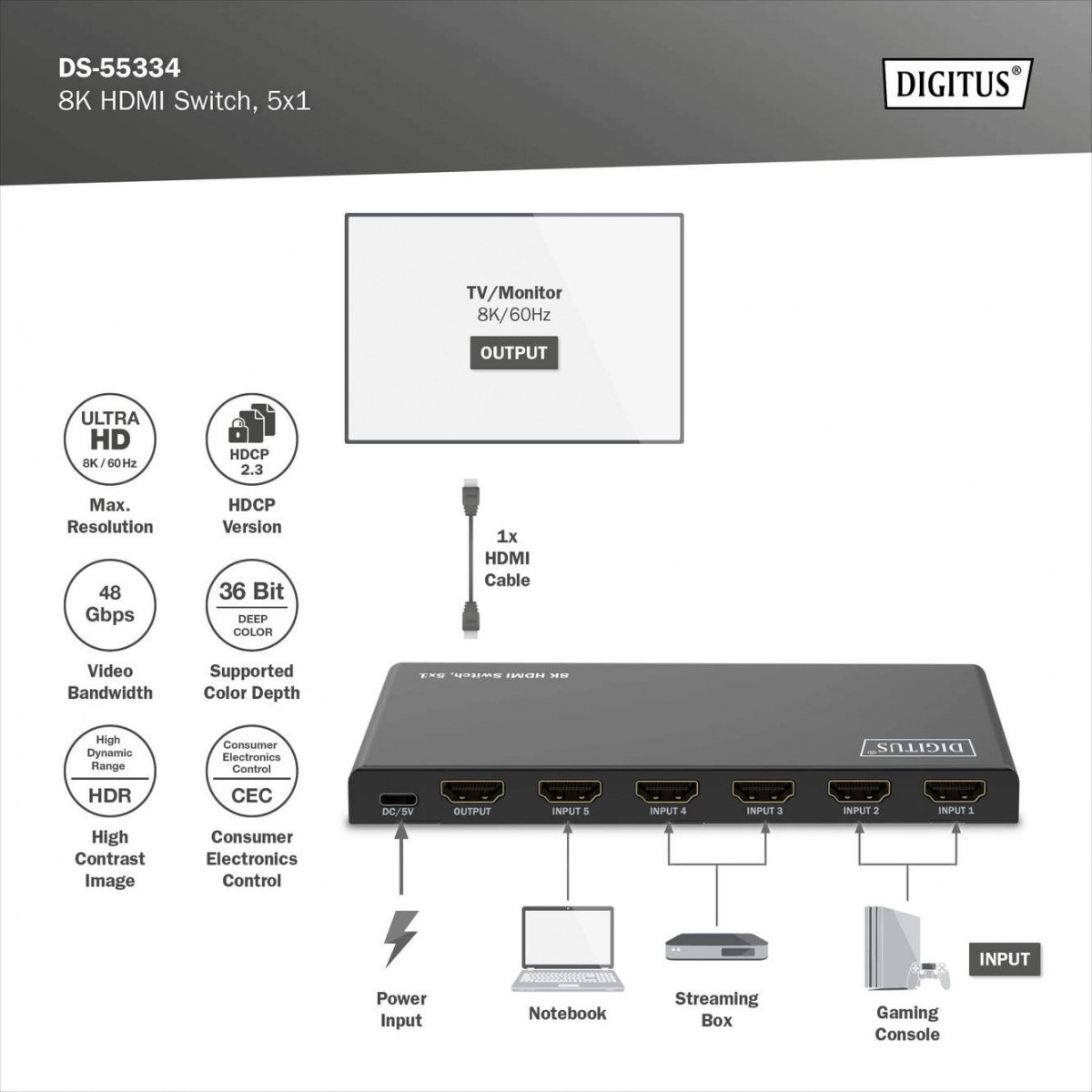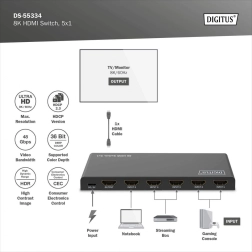 Proširite svoj televizor ili monitor dodatnim HDMI priključcima i prebacujte između do pet izvora jednim kabelom. Preklopnik DIGITUS nudi 8K/60 Hz (4:4:4), HDMI 2.1, HDR i HDCP 2.3. Upravljanje je jednostavno zahvaljujući daljinskom upravljaču i automatskom prebacivanju, napajanje osigurava USB‑C, a izdržljivo metalno kućište uklapa se u svaku postavu.