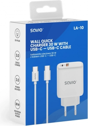Kompaktan mrežni punjač Savio snage 30 W nudi brzo punjenje Power Delivery i Quick Charge 3.0 za telefone, tablete i odabrana prijenosna računala. U pakiranju se nalazi izdržljiv USB‑C ↔ USB‑C kabel duljine oko 1 m, pa možete početi puniti odmah. Zahvaljujući dvama priključcima (USB‑C i USB‑A) te naprednoj zaštiti idealan je za dom, ured i putovanja.