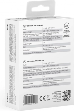 Uživajte u brzom i sigurnom punjenju bez kompromisa. Punjač Savio 30 W kombinira USB‑C PD za moderne uređaje i USB‑A QC 3.0 za široku kompatibilnost sa starijim kabelima. Kompaktno kućište s EU utikačem lako stane u džep ili putnu torbu.