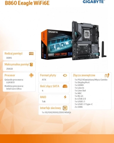 Sastavite snažno i pouzdano računalo na platformi Gigabyte B860 Eagle Wi‑Fi 6E. Ploča podržava najnovije Intel Core Ultra procesore (2. generacija), dvokanalne DDR5 module s XMP profilima te nudi robusno napajanje VRM Digital Twin 12+1+2 za stabilne performanse i pri zahtjevnom radu i igrama.