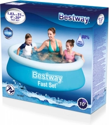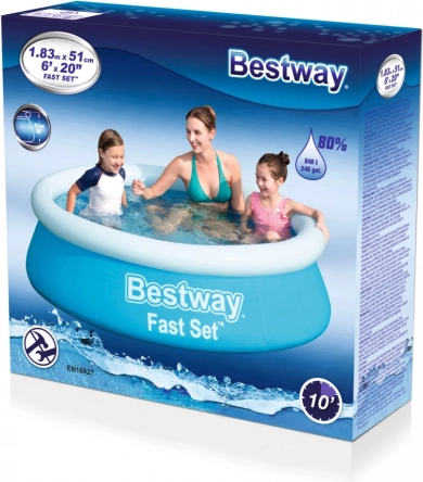 Nafukavajući bazen Bestway Fast Set s promjerom 183 cm i visinom 51 cm praktično je i ekonomično rješenje za kućnu upotrebu. Izrađen je od izdržljivog materijala DuraPlus62, koji osigurava trajnost, otpornost na UV zračenje i mehanička oštećenja. Lako ga postavite na travu ili tvrdu, ravnu podlogu.