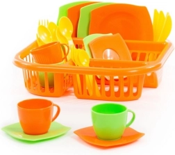 S ovim šarenim setom posuđa svako dijete brzo će otkriti čaroliju kuhanja i čišćenja. Set je lagan i prilagođen malim dječjim rukama, što ga čini idealnom igračkom za najmlađe. Pustite svoju djecu da uživaju u realnoj igri u kuhinji: pripremu ručka i zatim čišćenje kao čarolijom. Svi dijelovi izrađeni su od plastike, što olakšava rukovanje i sigurno je.