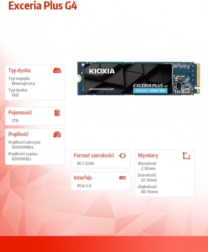 Iskoristite performanse nove generacije s SSD-om KIOXIA EXCERIA PLUS G4. Najnovije sučelje PCIe 5.0 podiže brzine na novu razinu, pa je pokretanje igara, rad s videom i velikim projektima glatko i gotovo trenutačno. Zahvaljujući kapacitetu od 2 TB dobit ćete dovoljno prostora za sustave, aplikacije i knjižnice podataka.