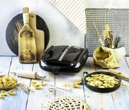 Snažna snaga do 1600 W ravnomjerno raspoređuje toplinu, lampica vas obavještava o spremnosti za pečenje, a robusno bakelitno kućište s termoizoliranim rukohvatima brine se za udobnu i sigurnu uporabu. Zapinjač poklopca drži kalupe čvrsto zajedno za ravnomjerno pečenje.