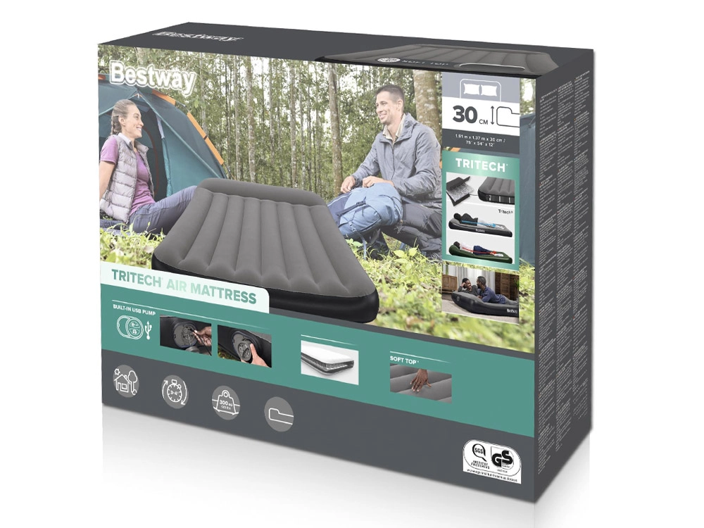 Dvosjedni napuhavajući madrac BESTWAY TRITECH nudi visoku izdržljivost, stabilnu potporu i brzo napuhavanje za 3–4 minute zahvaljujući ugrađenoj USB pumpi. Integrirani jastuk, mekana površina protiv klizanja posteljine i nosivost do 300 kg čine ga idealnim rješenjem za dom, goste i kampiranje.