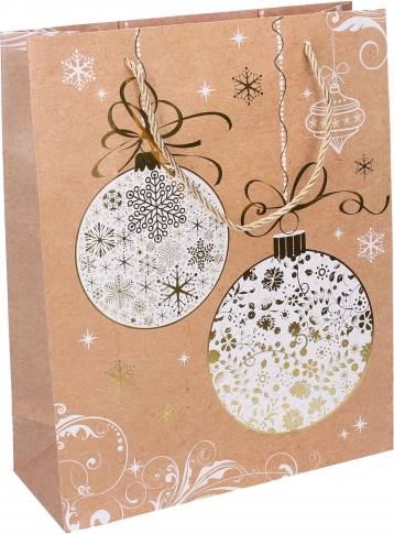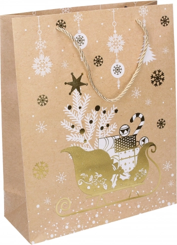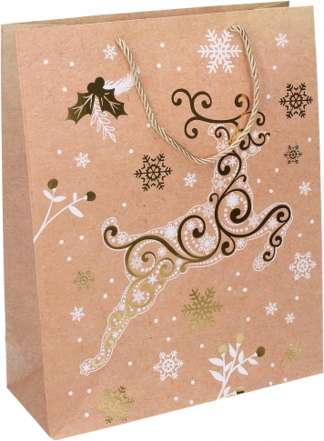 Stilska poklon-vrećica veličine M dimenzija 26 × 32 × 10 cm idealna je za pakiranje božićnih poklona. Nudi 4 različita božićna motiva, čvrstu izradu i praktične ručke za udobno nošenje.
