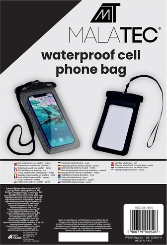 Zaštitite svoj pametni telefon od vode, pijeska i prašine s univerzalnom vodonepropusnom futrolom do 7" marke MALATEC. Zahvaljujući dvotočkovnom sigurnosnom sustavu zaključavanja telefon ostaje siguran čak i pri potpunom uranjanju. Obje strane su potpuno osjetljive na dodir, tako da možete pisati poruke, telefonirati i fotografirati bez vađenja telefona iz futrole. Lagana i praktična konstrukcija s trakicom za vrat idealna je za plažu, uz vodu i za kišu.
