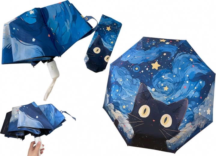 Automatski sklopivi kišobran je idealan izbor za svakodnevno korištenje i putovanja. Zahvaljujući čvrstoj i laganoj konstrukciji osigurava dugovječnost i otpornost na jake nalete vjetra. Ovaj kišobran privlači pažnju svojim jedinstvenim dizajnom s motivom crne mačke na plavom nebu.