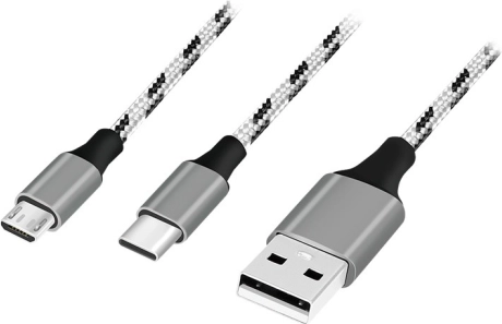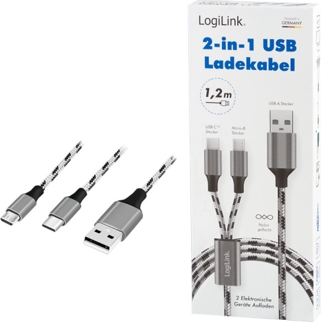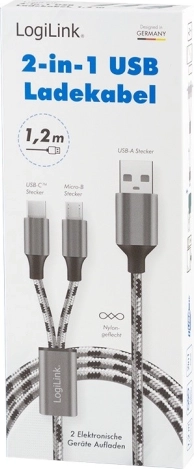 Univerzalni 2-u-1 kabel marke LogiLink za punjenje i prijenos podataka nudi konektore Micro USB i USB‑C u jednom. Zahvaljujući opletenoj tekstilnoj izvedbi kabel je izdržljiv, fleksibilan i prikladan za širok raspon uređaja. Podržava punjenje do 5 V / 2 A (10 W), pa pouzdano napaja telefone, slušalice i malu elektroniku bez potrebe za više kabela.