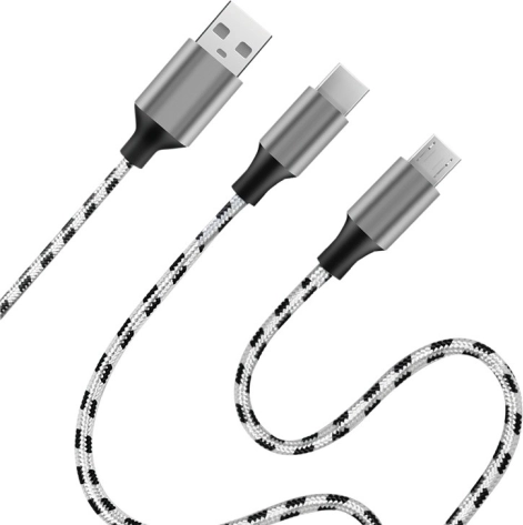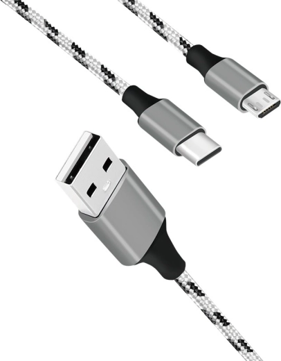 Ovaj praktični kabel kombinira Micro USB i USB‑C u jednom rješenju, pa lako povezujete starije i novije uređaje. Opletena pamučna površina povećava otpornost na lomljenje i trošenje, dok metalni završeci dodaju premium izgled i dug vijek trajanja.