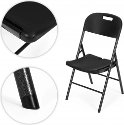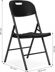 Stolice se sklapaju jednim pokretom, što omogućuje brzo i jednostavno pripremanje sjedala za više gostiju. Metalni okvir obložen je prahom za otpornost na vremenske uvjete. Zaštitne kapice na nogama sprječavaju ogrebotine poda i osiguravaju stabilnost stolice.