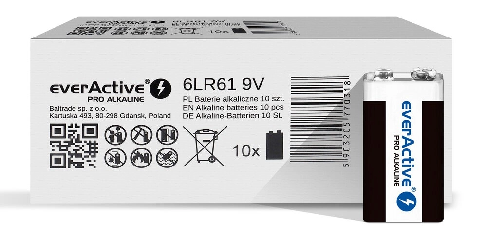 Alkalne baterije 6LR61 (9 V) EVERACTIVE PRO ALKALINE dizajnirane su za maksimalnu pouzdanost u zahtjevnim uvjetima. Ojačana i zabrtvljena izvedba minimalizira rizik od curenja i osigurava stabilne parametre tijekom dugog skladištenja i rada.