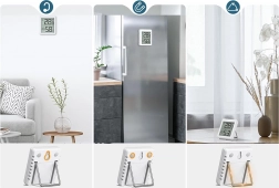 Praktična konstrukcija omogućuje postavljanje na stol pomoću integriranog postolja ili pričvršćivanje na metal zahvaljujući magnetu. Napajanje osigurava standardna CR2032 baterija (u pakiranju), pa je uređaj spreman za trenutačnu uporabu.