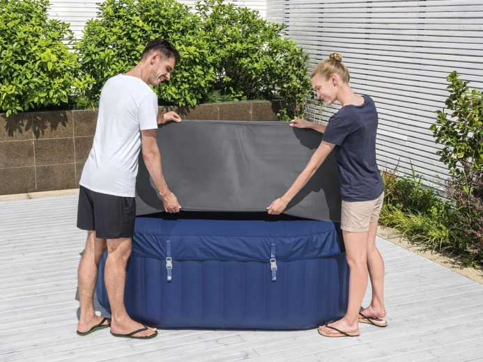 Izdržljiv materijal DuraPlus dizajniran je za dugotrajnu vanjsku upotrebu – vodootporan je, dimenzijski stabilan i jednostavan za održavanje. Praktični otvor s patentnim zatvaračem omogućuje spajanje ugrađene ili vanjske pumpe bez potrebe za skidanjem pokrova, pa je održavanje praktično i brzo.