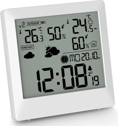Za veću udobnost tu su pokazatelj temperaturnog komfora (3 razine), strelice trenda za promjene temperature i vlažnosti te praktične funkcije kao što su sat s formatom 12/24 h, kalendar i alarm s funkcijom snooze. Ljubitelje noćnog neba razveselit će prikaz mjesečevih mijena. Pakiranje od certificiranih FSC materijala naglašava brigu za okoliš.