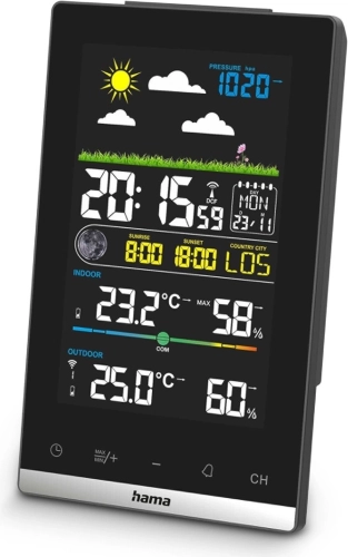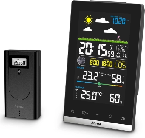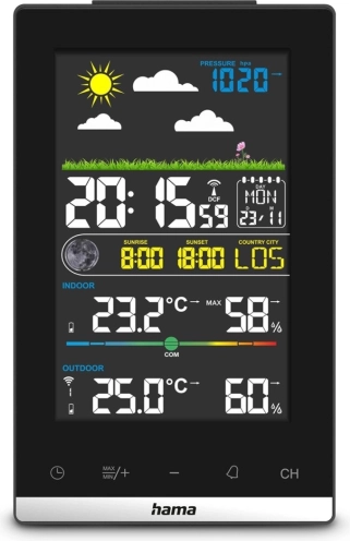 Meteorološka stanica HAMA Jamaica donosi svakodnevnu sigurnost u planiranju zahvaljujući preglednom šarenom VA zaslonu koji je izvrsno čitljiv iz svakog kuta. Prikazuje trenutačnu unutarnju i vanjsku temperaturu i vlažnost, atmosferski tlak, faze Mjeseca te izlazak i zalazak sunca za 176 svjetskih gradova. Prognoza vremena sa 7 intuitivnih simbola pravovremeno upozorava na promjene.